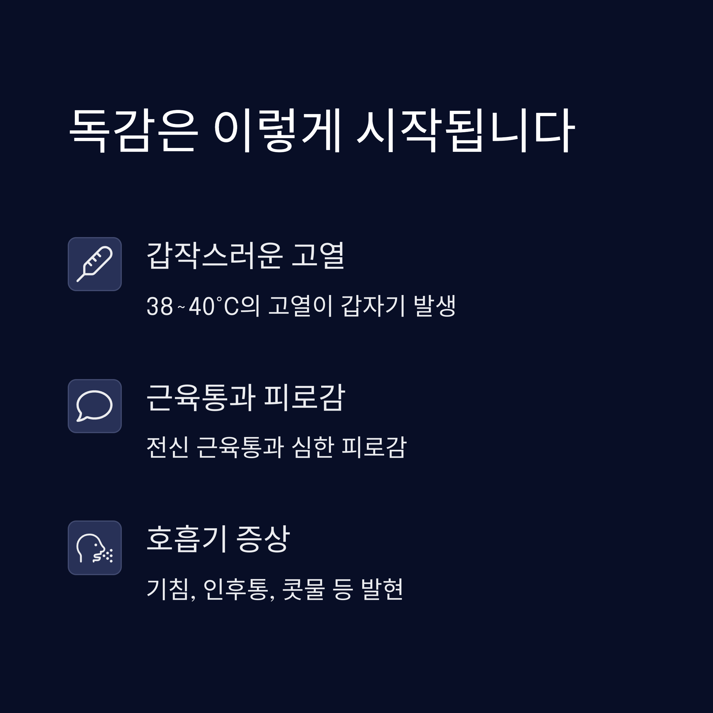 | 독감 초기 증상 | 갑작스러운 고열, 근육통, 피로감, 기침, 구토, 설사 등 |